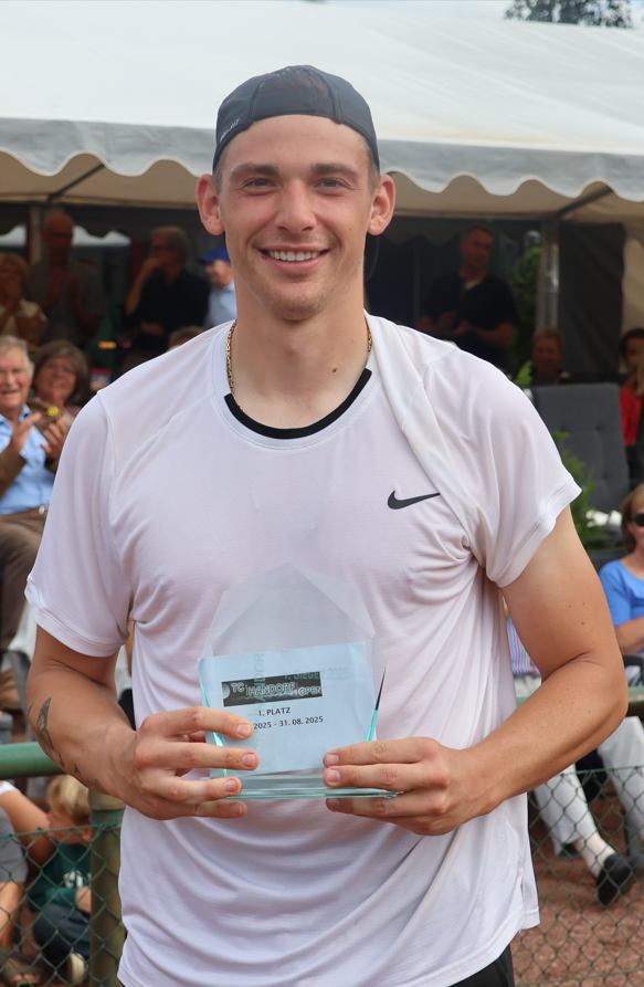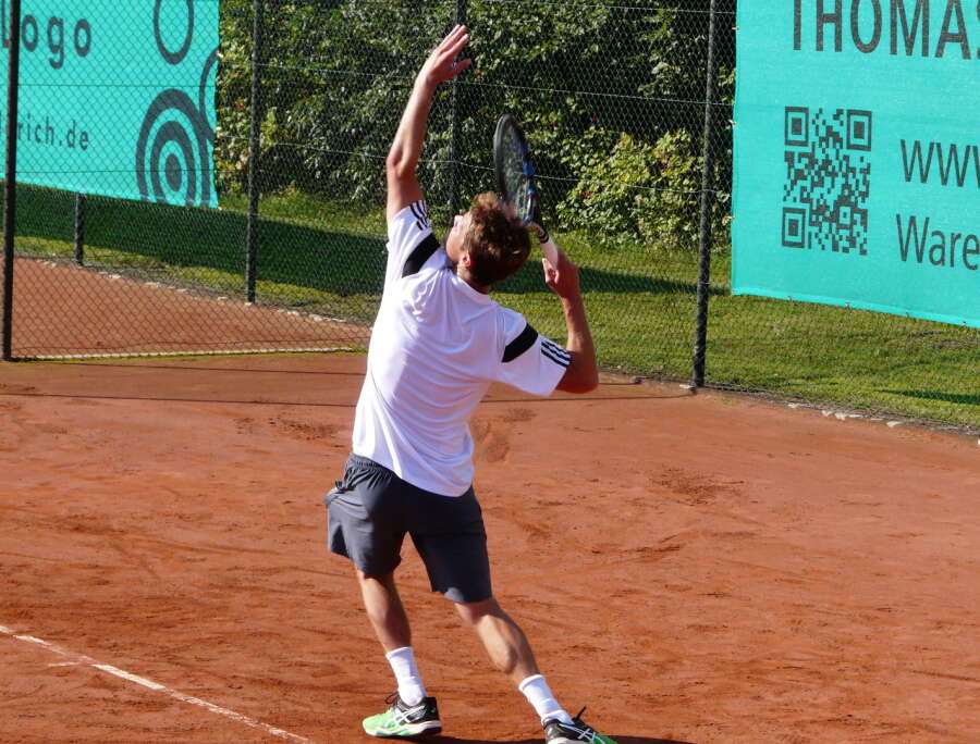 Hier jedoch musste auch er sich dem Titelverteidiger und Turnierfavoriten Christopher Koderisch, in der deutschen Rangliste an Nr. 46 geführt, geschlagen geben. - Die Tatsache, dass es pünktlich zum Finale zu regnen begann, trübte die gute Stimmung nur wenig, denn beide Akteure ließen sich vom Wetter nicht beirren und boten ein tolles Spiel. Dabei machte der vermeintliche Außenseiter dem Favoriten das Leben so schwer wie möglich, der erste Satz konnte erst im Tiebreak entschieden werden, und das mit einem knappen 7-5. Dann setzte sich das sichere Spiel von Koderisch immer mehr durch, und der zweite Satz ging glatt an ihn.